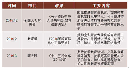 當前國家大力促使教育市場走向市場化、民營化、信息化,為K12在線教育創造了發展契機。國家積極通過政府購買、后補助、稅收優惠等實質性支持手段擴大行業需求,帶動行業發展,力求解決教育不公平問題。這將持續利好在線K12教育產品內容開發、教育信息化、教育設備發展。