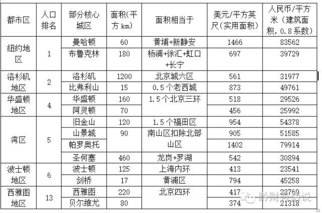 需要明確的是,美國(guó)的city/county和中國(guó)的地級(jí)市/直轄市概念完全不同:county大致類似于中國(guó)區(qū)/縣的大小,最小的city只有一個(gè)街道那么大,最大的city則和區(qū)/縣相當(dāng)或略大。下表中的”核心城區(qū)”,指的就是city/county層面,其大小在后一列用中國(guó)大家熟知的區(qū)域來(lái)示意。