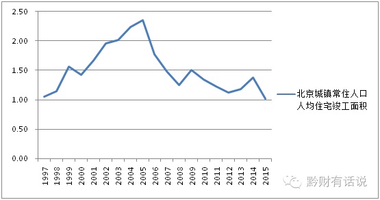 下表是北京歷年住宅竣工面積,包括商品住宅和非商品住宅(數(shù)據(jù)來(lái)源為北京統(tǒng)計(jì)年鑒)。可以看到,2005年前,人均住宅竣工面積快速增加,2005年時(shí),平均每人每年能新竣工達(dá)到2.35平米,這是一個(gè)很可觀的數(shù)字。到2015年時(shí),這一數(shù)字下降到1.01平米。