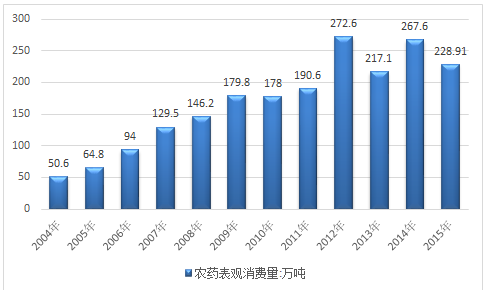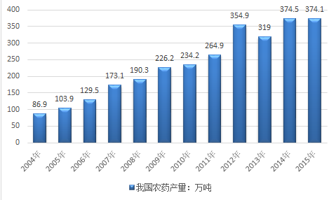 2015年我國農藥產量為374.1萬噸,出口量為150.95萬噸,進口量為5.76萬噸,2015年國內農藥表觀消費量為228.91萬噸。