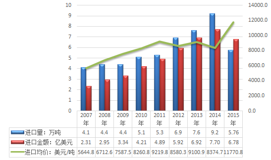 2007-2015年我國農藥進口數量、金額及均價走勢圖