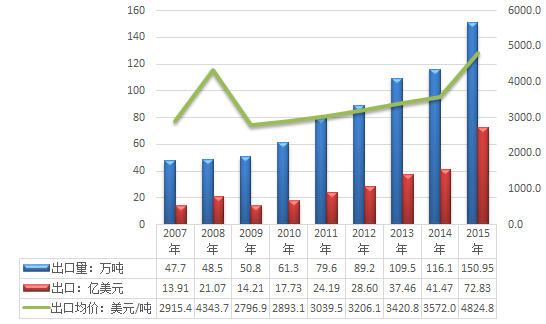 2015年我國農藥出口總量為150.95萬噸,出口數量同比增長30.0%;出口總金額為72.83億美元,出口金額同比增長75.6%;出口均價為4824.8美元/噸。出口均價同比增長35.1%.