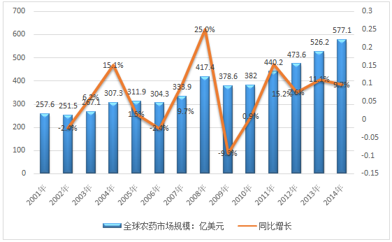 2014年全球作物保護農藥的銷售額已經達到了577.1億美元,同比增長9.7%,全球農藥行業連續3年高增長,可是2014年盈利增速明顯放緩,利潤同比下降0.7%。