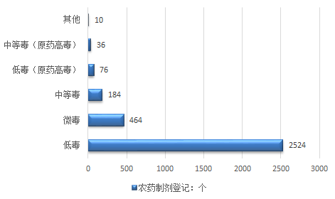 按毒性統計:低毒2,524 個,微毒464 個,中等毒184 個,低毒(原藥高毒)76 個,中等毒(原藥高毒)36 個,其他10 個。