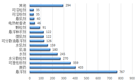2015 年按劑型統計:懸浮劑767 個,原藥403個,可濕性粉劑359 個,水分散粒劑270 個,水劑245 個,乳油180 個,水乳劑159 個,可分散油懸浮劑126 個,微乳劑122 個,懸浮種衣劑122 個,顆粒劑91 個,電熱蚊香液46 個,懸乳劑40 個,可溶粉劑35 個,可溶粒劑35 個,其他294 個。從劑型角度分析,乳油從2014 年的第4 位變為第5 位,排名前兩位的依然是懸浮劑和水分散粒劑。