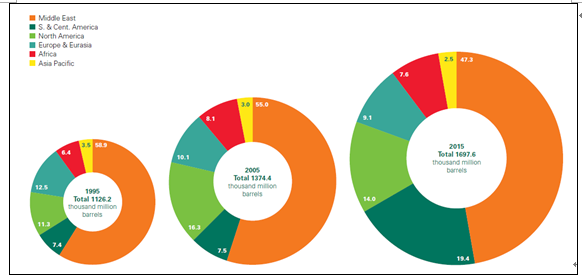 2015年中東石油產量為14.12億噸,2015年增至4.26億噸;非洲石油產量為3.98億噸,消費量為1.83億噸。