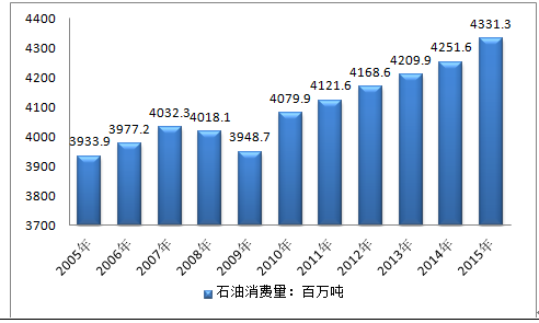 根據BP公司的統計,2010年全球石油消費量為40.80億噸,2015年增長至43.31億噸。