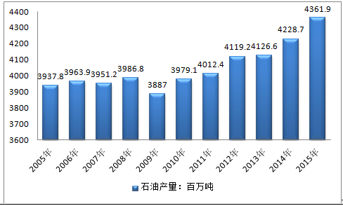 根據BP公司的統計,2010年全球石油產量約為42.29億噸,2015年增長至43.62億噸。