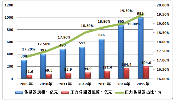 2009-2015年中國(guó)壓力傳感器行業(yè)及占比傳感器比重情況