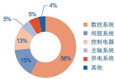 2014年中國機床電子市場規(guī)模為425億元。2014年中國機床電子市場中,數(shù)控系統(tǒng)市場規(guī)模約為246.5億元,占比58.0%;伺服系統(tǒng)市場規(guī)模為65.5億元,占15.4%;控制電器市場規(guī)模54.0億元,占比12.7%;主軸系統(tǒng)市場規(guī)模約為20.8億元,占比4.9%;供電系統(tǒng)市場規(guī)模22.5億元,占比5.3%;還余3.7%為其他機床電子元器件