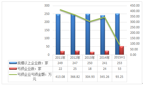 2011-2015年上半年我國電容器及其配套設備制造行業企業虧損情況