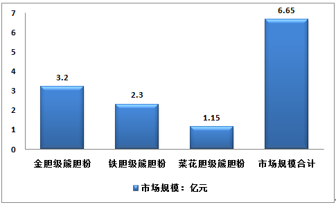 中經(jīng)先略數(shù)據(jù)中心發(fā)布的《2016-2022年中國(guó)熊膽粉市場(chǎng)深度評(píng)估與未來(lái)發(fā)展趨勢(shì)報(bào)告》http://www.chyxx.com/research/201608/439269.html指出:2015年我國(guó)熊膽粉行業(yè)市場(chǎng)規(guī)模約6.65億元,其中金膽級(jí)熊膽粉約3.2億元,鐵膽級(jí)熊膽粉約2.3億元,菜花膽級(jí)熊膽粉約1.15億元。如下圖所示;2015年中國(guó)熊膽粉行業(yè)市場(chǎng)規(guī)模結(jié)構(gòu)