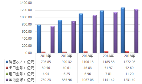 中經先略數據中心發布的《2016-2022年中國糖果行業市場專項調研與投資方向研究報告》指出:2015年我國糖果產業銷售收入為1272.98億元,出口金額52.69億元,進口金額11.20億元,國內需求規模1231.49億元。
