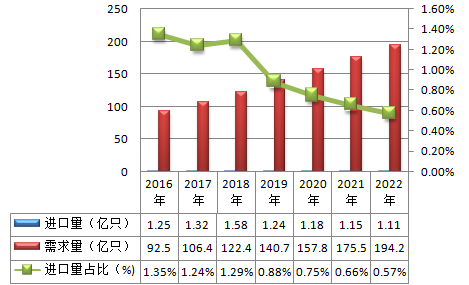 隨著我國本土企業的迅速發展,未來無線模塊需求增大的同時,進口將慢慢減小。預計2022年,我國無線模塊進口量為1.11億只,需求量為194.2億只,進口量占比為0.57%