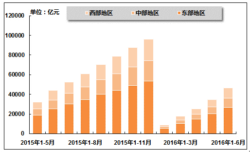 2015年5月-2016年6月累計不同地區房地產投資額完成情況