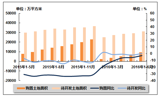 2016年1-6月,全國土地市場成交活躍,熱點城市“地王”頻出,一二線城市的土地市場已經復蘇,三四線城市的土地市場開始被關注,土地購置面積下滑幅度持續縮小,表明土地市場繼續維持回升的趨勢。國家統計局發布的數據顯示,2016年1-6月,全國房地產開發企業購置土地面積9,501.9萬平方米,同比下降3.0%,降幅同比縮小30.8個百分點,比2016年1-5月縮小2.9個百分點。同期,全國房地產開發企業待開發土地面積31,122.9萬平方米,增幅同比增長0.4%,而上年同期為下降13.0%,2016年1-5月為下降2.1%。