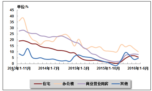 2013年11月-2016年6月累計不同用途房地產開發投資增長率變動趨勢