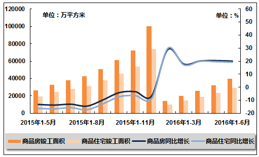 國家統計局發布的數據顯示,2016年1-6月,全國商品房累計竣工面積39,546.0萬平方米,同比增長20.0%,增幅比2016年1-5月回落0.4個百分點,上年同期為下降13.8%。其中,商品住宅竣工面積29,024.0萬平方米,同比增長19.2%,增幅比2016年1-5月回落0.4個百分點,上年同期為下降16.5%。