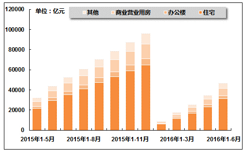2015年5月-2016年6月累計不同用途房地產開發投資完成額構成情況