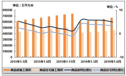 2016 1-6月,房屋新開工和施工面積同比增速繼續回落,顯示目前全國房地產市場分化格局明顯,大部分三四線城市仍面臨去庫存的壓力,整體樓市去庫存基調不變。國家統計局發布的數據顯示,2016年1-6月,全國商品房累計施工面積669,750.5萬平方米,同比增長5.0%,增幅同比提高0.7個百分點,比2016年1-5月回落0.6個百分點。其中,商品住宅施工面積459,444.4萬平方米,同比增長3.4%,增幅同比提高1.7個百分點,但比2016年1-5月回落0.3個百分點;房屋新開工面積77,536.9萬平方米,同比增長14.9%,增幅比2016年1-5月回落3.4個百分點,上年同期為下降15.8%。