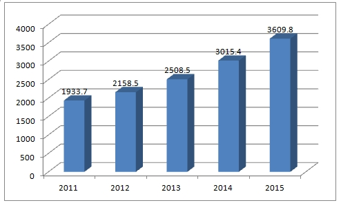 受到國內“中國2025制造”、“互聯網+”等新世紀發展戰略的帶動,以及外資企業加大在華投資影響,2015年中國集成電路產業保持高速增長。根據中國半導體行業協會統計,2015年中國集成電路產業銷售額為3609.8億元,同比增長19.7%。2011-2015年中國集成電路產業銷售額單位:億元