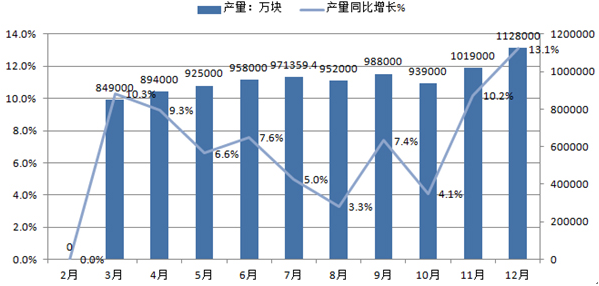 2015年12月中國集成電路產(chǎn)量為1128000萬塊,同比增長13.1%。2015年1-12月止累計(jì)中國集成電路產(chǎn)量10872000萬塊,同比增長6.8%。