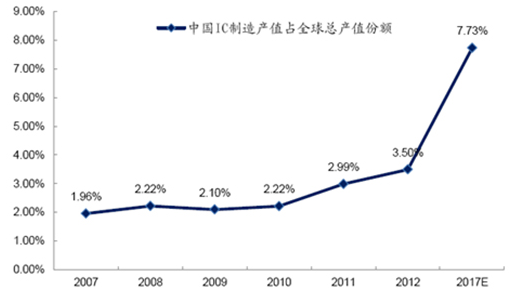 中國IC制造產(chǎn)值占全球總產(chǎn)值份額逐步提高