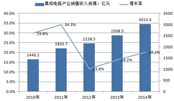 2010-2014 年中國集成電路產(chǎn)業(yè)銷售收入規(guī)模及增長
