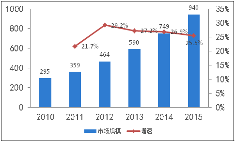 圖表 2011-2015年中國體檢行業市場規模(單位:億元)及增速