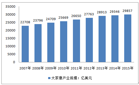 根據世界銀行統計數據,目前美國人均健康產業支出規模約為9200美元,2015年美國國內大健康產業規模達到29857億美元。