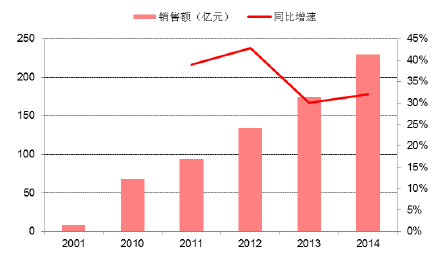 2001-2014年我國(guó)保健酒行業(yè)市場(chǎng)規(guī)模