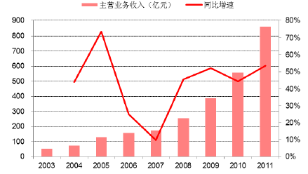 2004-2011年我國(guó)營(yíng)養(yǎng)、保健食品企業(yè)主營(yíng)收入