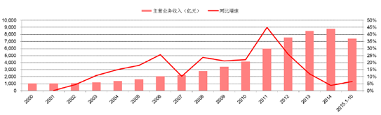 2000-2015年我國(guó)規(guī)模以上酒類生產(chǎn)企業(yè)主營(yíng)業(yè)務(wù)收入及同比增速