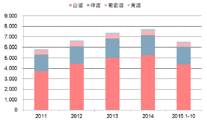 2011-2015年我國(guó)規(guī)模以上酒類生產(chǎn)企業(yè)主要酒類營(yíng)收(億元)