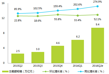 2016Q2中國第三方移動支付交易規模達到9.4萬億元,同比增長274.9%,環比增長52.1%。