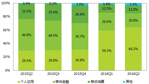 2016Q2中國第三方移動支付市場交易規模結構中,個人應用占比64.2%,移動金融占比20.8%,移動消費占比11.8%,其他占比3.3%。