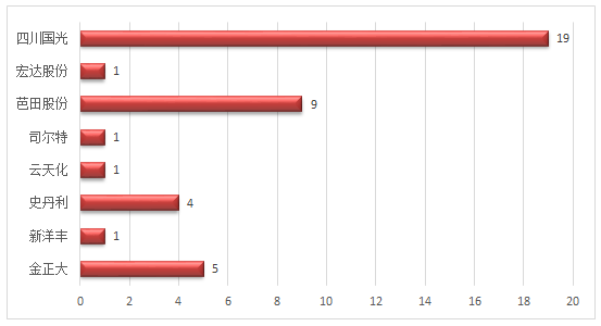 細分品種登記數金正大含氨基酸水溶肥2有機水溶肥料0中量元素水溶肥料1微量元素水溶肥料0含腐植酸水溶肥料1大量元素水溶肥料1合計5史丹利含氨基酸水溶肥2有機水溶肥料0中量元素水溶肥料0微量元素水溶肥料1含腐植酸水溶肥料0大量元素水溶肥料1合計4云天化含氨基酸水溶肥0有機水溶肥料0中量元素水溶肥料0微量元素水溶肥料0含腐植酸水溶肥料0大量元素水溶肥料1合計1司爾特含氨基酸水溶肥0有機水溶肥料0中量元素水溶肥料0微量元素水溶肥料0含腐植酸水溶肥料0大量元素水溶肥料1合計1芭田股份含氨基酸水溶肥2有機水溶肥料0中量元素水溶肥料0微量元素水溶肥料3含腐植酸水溶肥料4大量元素水溶肥料0合計9宏達股份含氨基酸水溶肥0有機水溶肥料0中量元素水溶肥料0微量元素水溶肥料0含腐植酸水溶肥料0大量元素水溶肥料1合計1四川國光含氨基酸水溶肥9有機水溶肥料0中量元素水溶肥料2微量元素水溶肥料2含腐植酸水溶肥料3大量元素水溶肥料3合計19資料來源:公開資料整理