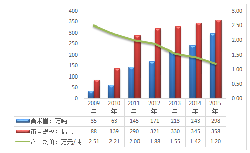 2009-2015年我國水溶性肥料市場規模及均價走勢圖
