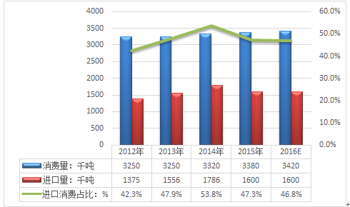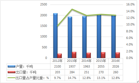 -2012年2013年2014年2015年2016E產量:千噸21001937196320552026消費量:千噸32503250332033803420出口量:千噸203284251270260進口量:千噸13751556178616001600資料來源:公開資料整理