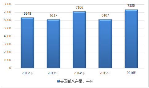 中經先略數據中心發布的《2016-2022年中國水稻市場專項調研及全景評估報告》顯示,2015年美國水稻播種面積為104.2萬公頃,2015年美國國內稻米產量為610.7萬噸,產量較上年同期下降14.06%,預計2016年美國稻米產量在733.5萬噸左右。