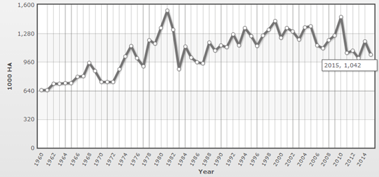 核心提示:1960-2015年美國水稻播種面積走勢圖:千公頃資料來源:公開資料整理智研咨詢發布的《2016-2022年中國水稻市場專項調研及全景評估報告》顯示,2015年美國水稻播種面積為104.2萬公頃,2015年美國國內稻米產量為610.7萬1960-2015年美國水稻播種面積走勢圖:千公頃