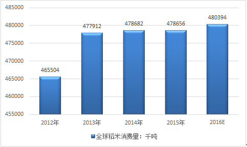 2012-2016年全球稻米消費(fèi)量統(tǒng)計(jì)表:千噸