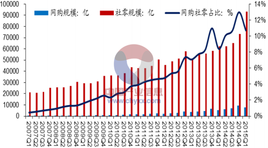 2007-2015年中國網絡購物規模及增長率