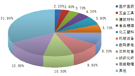 從我國電子商務網站所處的行業分布來看,排在前十名的依次為:服裝鞋帽、紡織化纖、農林畜牧、數碼家電、機械設備、化工塑料、食品糖酒、建筑建材、五金工具、醫療醫藥,其中服裝鞋帽和紡織化纖占比分別為13.8%和10.5%。