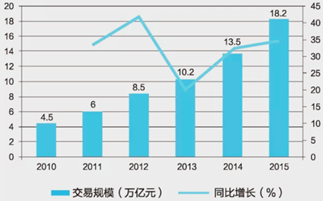 2010-2015年中國電子商務交易額及增長情況