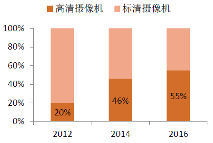 以目前國際最新的視頻標準H.265 為例,在同等清晰度下,H.265 視頻標準碼率是前一代H.264 碼率的一半,大幅提升存儲效率;同時基于H.265 標準各大廠家也在推出更有效的編碼算法,如海康威視推出的Smart265,可以針對不同的場景設定不同的碼率,在人流量不密集的場景中(如樓道等),碼率最高可降低70%以上。更高效編碼算法的出現,大大的降低了超高清的成本,進一步促進了超高清的普及,也為智能的實用化應用鋪平了道路。據統計,2012 年全國高清攝像機(包括IPC、HD-SDI、HD-MDI,720p、1080p、4K 等全部在內)總出貨量已突破360 萬臺,約占到攝像機市場總量的20%。2014 年,高清攝像機總出貨量約為920 萬臺,約占到攝像機市場總量的46%。我們預計到2016年,高清攝像機總出貨量將達1500 萬臺,高清攝像機的出貨量將超過標清攝像機。攝像機編碼效率提升