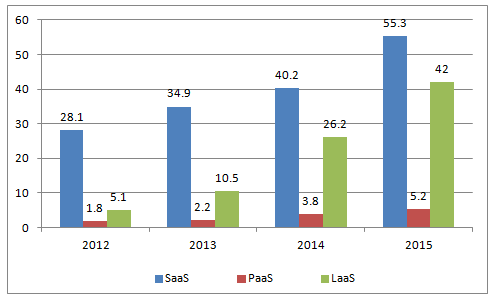 2012-2015年中國公共云服務(wù)SaaS/ PaaS/ LaaS市場規(guī)模(單位:億元)