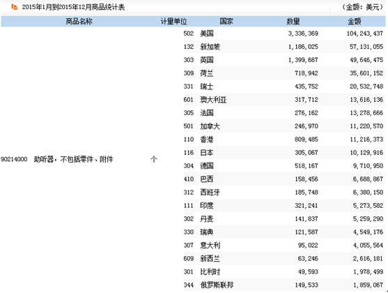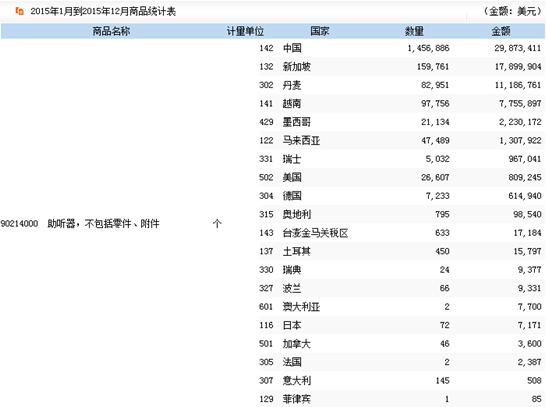 2015年我國助聽器主要出口國家及地區(qū)主要為美國、新加坡、英國、荷蘭、瑞士、澳大利亞、法國、加拿大、香港、日本。