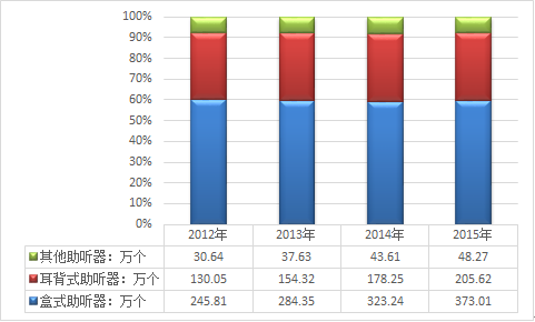 2012-2015年我國助聽器產(chǎn)品需求結(jié)構(gòu):按數(shù)量