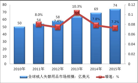 2010-2015年全球成人失禁用品市場規模及增速:億美元,%